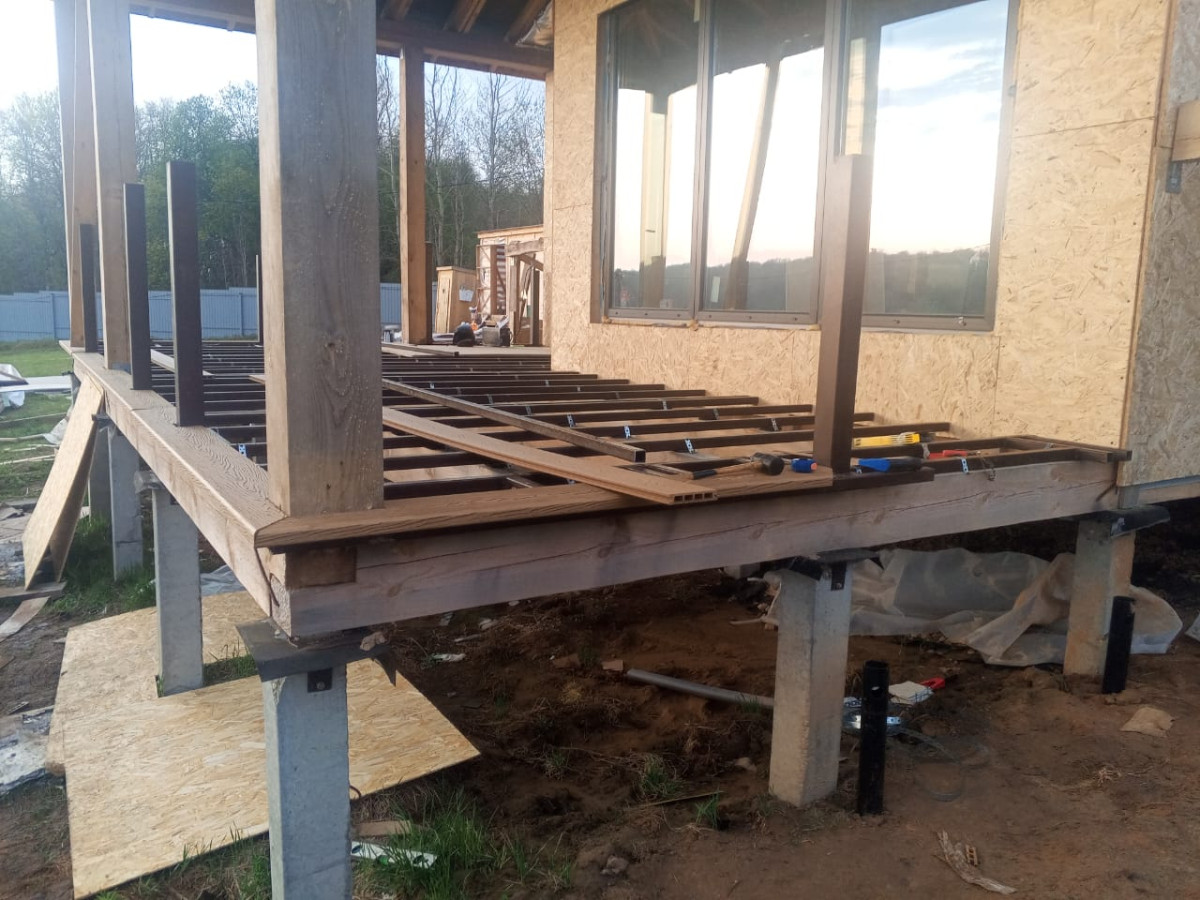 На каркас из бруса установлен металлопрофиль и смонтирована доска. По периметру отделка ступенью шириной 165 мм. Сделаны ступени и ограждение.